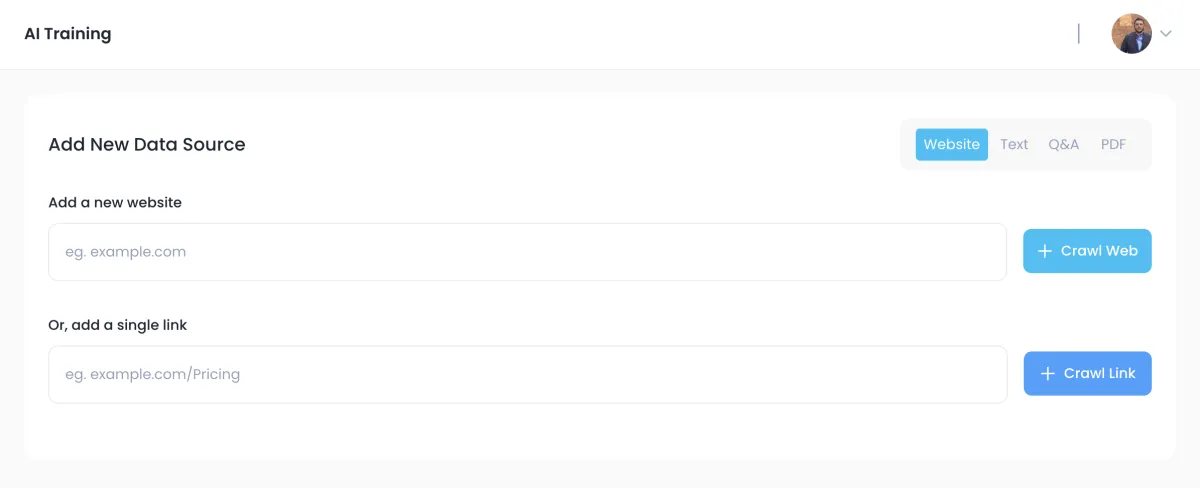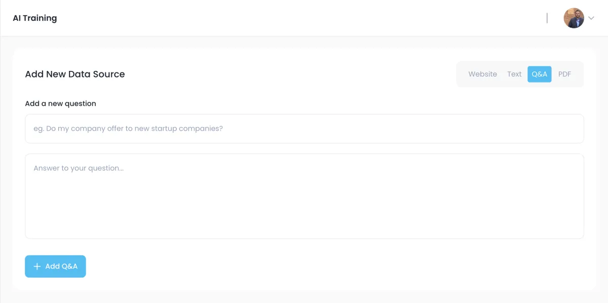 Enter your website, add text information, upload, add Q&A, or a PDF to start training the AI on your business.
