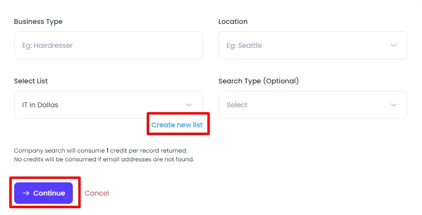 The List Type will default to "Company Search."
