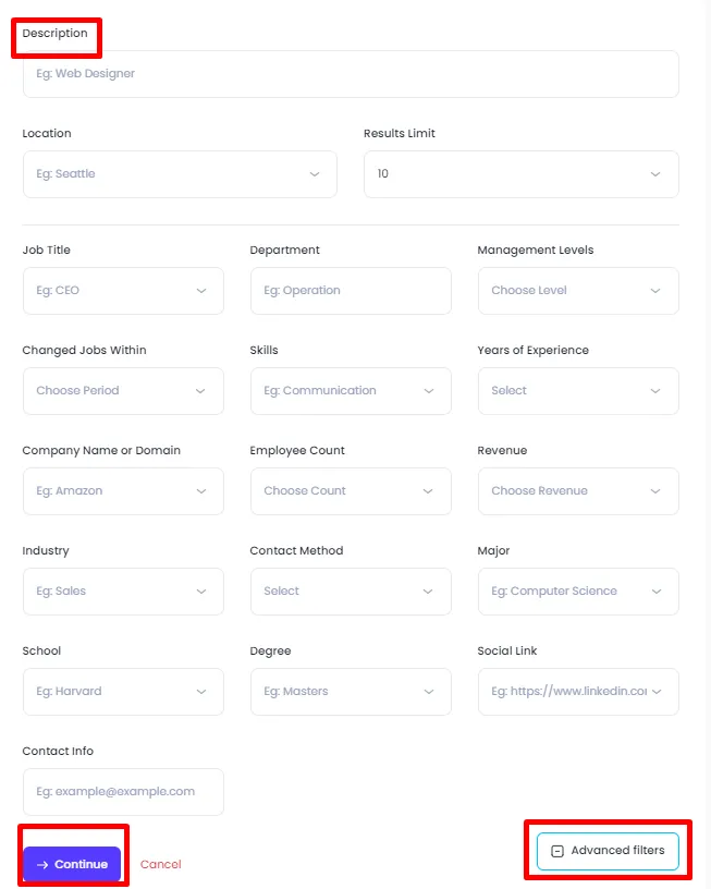 Company Details: Filter by company name, domain, employee count, or revenue.