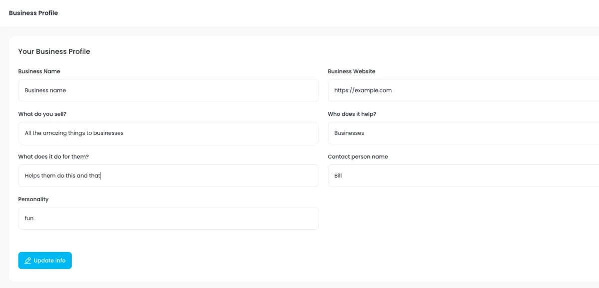 Once you have filled in each box, click "Update info" to save your new Business Profile.