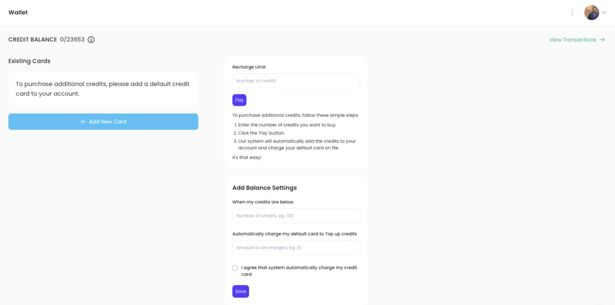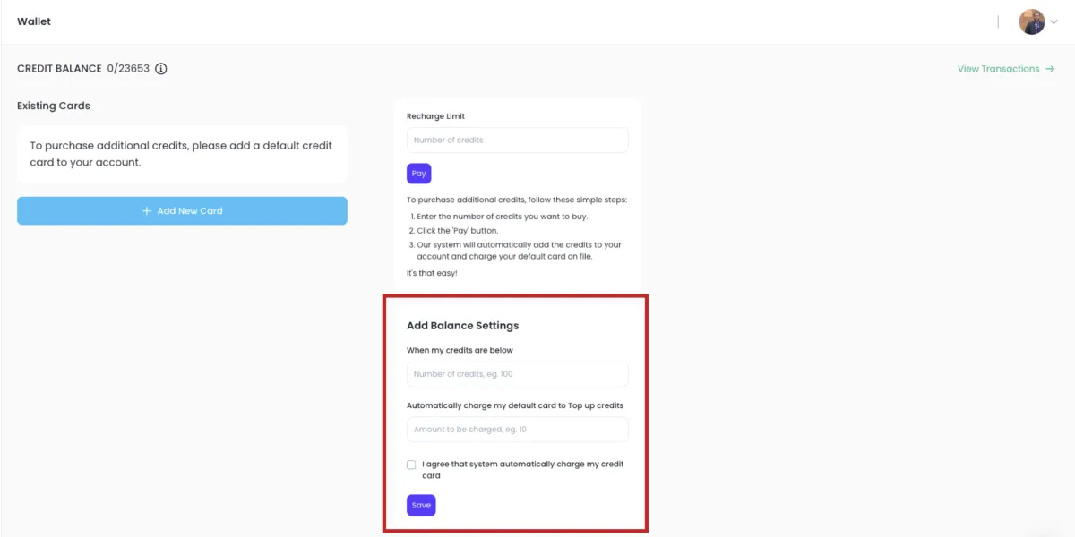 Choose the threshold amount at which your account will automatically be topped up (e.g., when credits drop below 100).